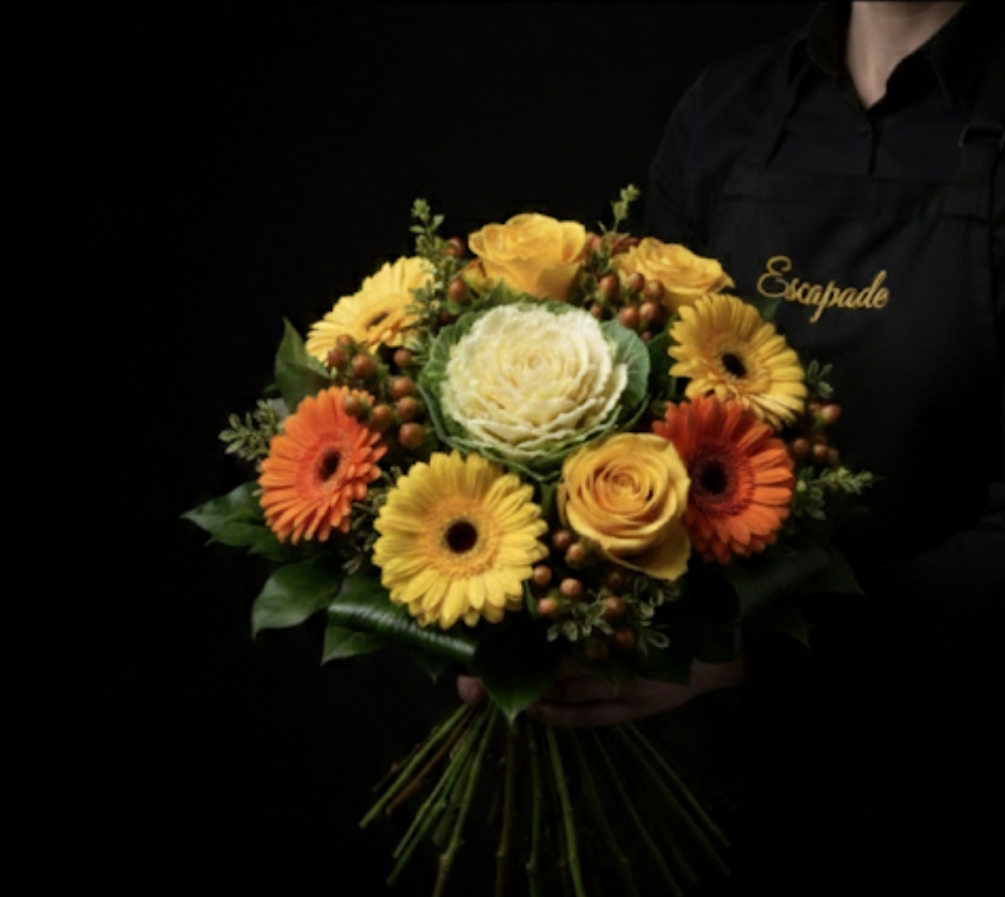 ​Une composition chaleureuse et structurée qui capture l’essence même de la générosité. Ce bouquet rond serré offre un contraste élégant entre la délicatesse des fleurs nobles et le caractère rustique du chou ornemental. Ses teintes vitaminées apporteront une lumière instantanée à votre intérieur ou feront le bonheur d’un proche pour toute occasion festive.