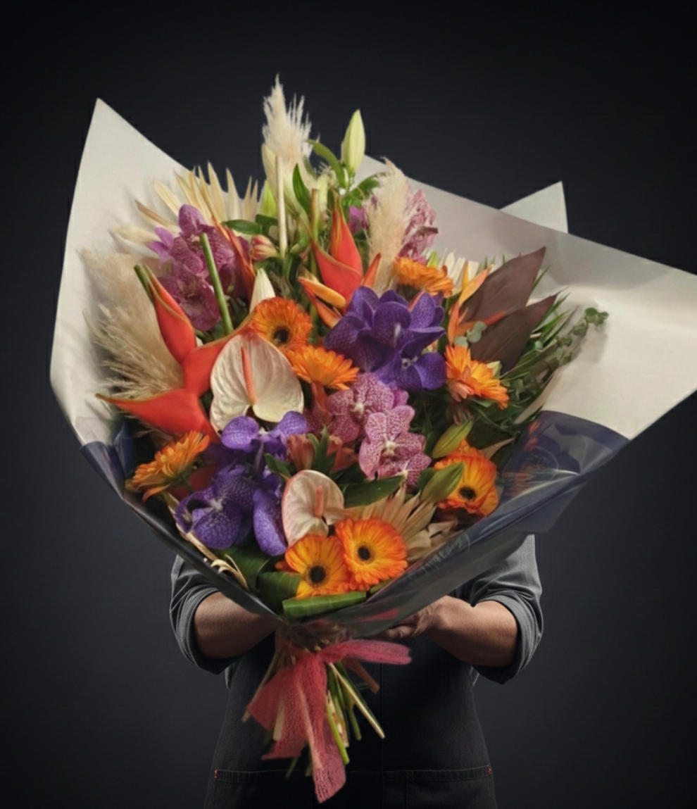Une véritable explosion de couleurs et de formes exotiques qui transporte immédiatement vers des horizons lointains. Ce bouquet « énorme » et spectaculaire est une pièce de design floral conçue pour impressionner par son envergure et sa force visuelle. Alliant des textures graphiques et des teintes vibrantes, il incarne l’opulence de la flore tropicale dans une composition à couper le souffle.